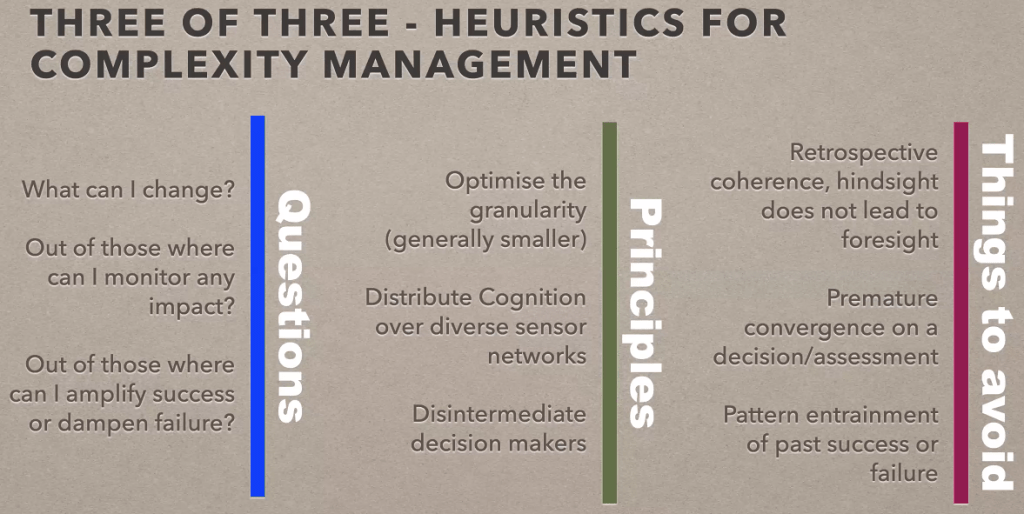 The chart is from Dave Snowden, who has been theorizing anthro-complexity. In non-academic language: natural sciences tell us that there are fundamental limitations that we have as humans. We can’t hold more than seven things in our mind at once. We are pattern-based animals and draw on past experience to make quick judgements (without even knowing it) based on whichever pattern comes to mind first. We make meaning through short anecdotes and conversations with others rather than scanning all available data. We are trapped in patterns created by our jobs and relationships and won’t notice things that don’t fit what’s supposed to happen in a given context. We aren’t really rational and make decisions with our emotions and our guts. This is some crucial self-awareness.