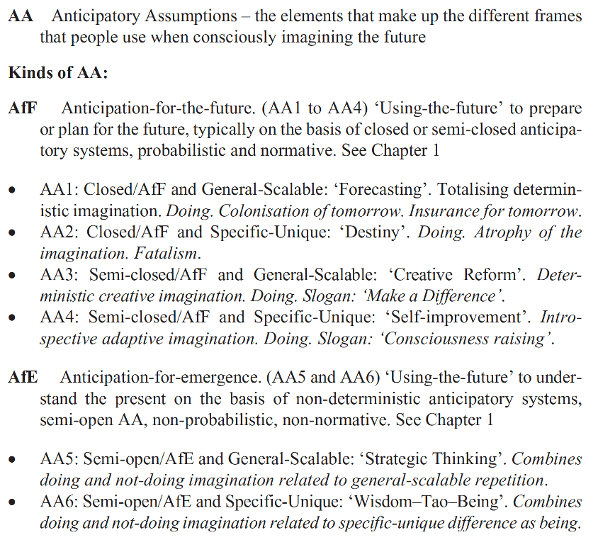 You’ll notice that the anticipatory assumptions under AfE include strategic thinking for general-scalable repetition and wisdom-Tao-being. Essentially, anticipating for emergence requires wide adoption of general frameworks that can accommodate a wide variety of futures. The tie to Eastern Philosophy reminds me of Galtung’s Daoist Social Science Epistemology that I studied at the Galtung-Institut. In that line of thinking, Galtung derived rules for a Daoist epistemology that would counter Cartesian epistemology. It’s interesting how often complexity thinking and Eastern philosophy intersect.